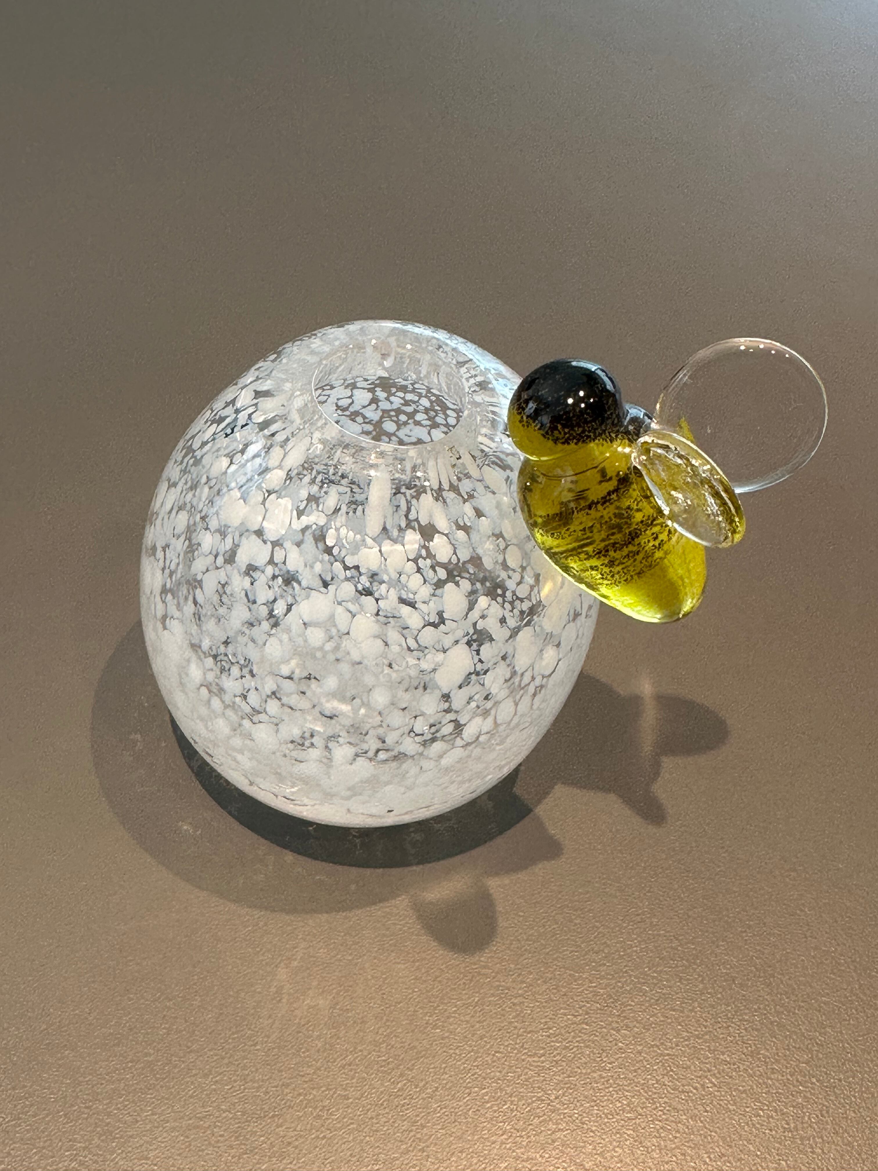 愛らしいハチがデザインされた花器です。1輪の花を飾るとまるで花にハチが寄り添うようです。 ミツバチは女王蜂を中心とした群れをつくり、せっせとハチミツを蓄えることから、繁栄や豊かさ、幸福の象徴です。 また、協調性や勤勉さも象徴します。 日常の中に小さな幸せを感じられるアイテムとして、大切な方への贈り物にも最適です。 サイズ:縦9×横8×奥行6.5cm デザイン ichi glass 原加奈子 制作 ichi glass 原加奈子 *手作りのため、形や色に多少の個体差がございます。