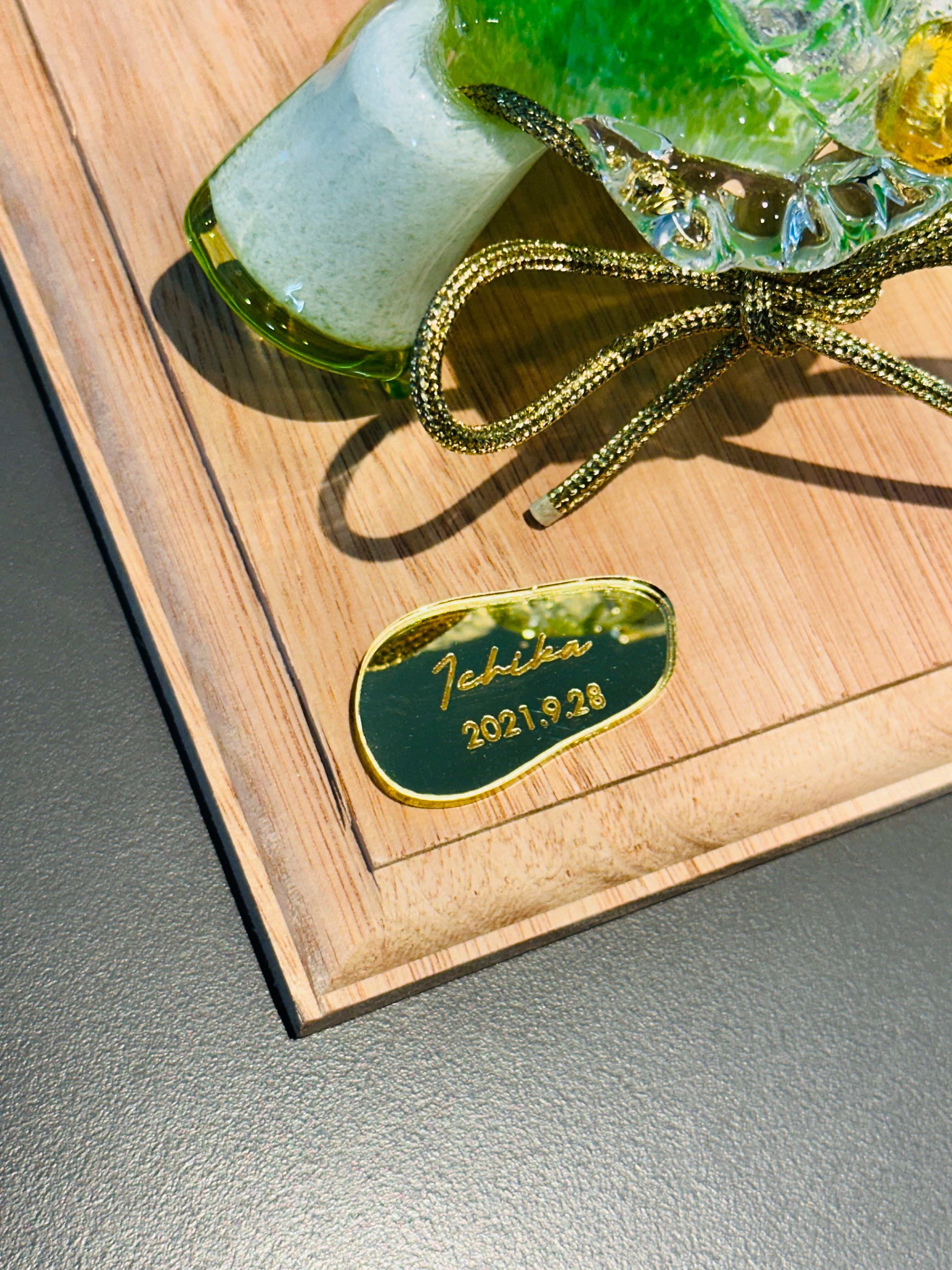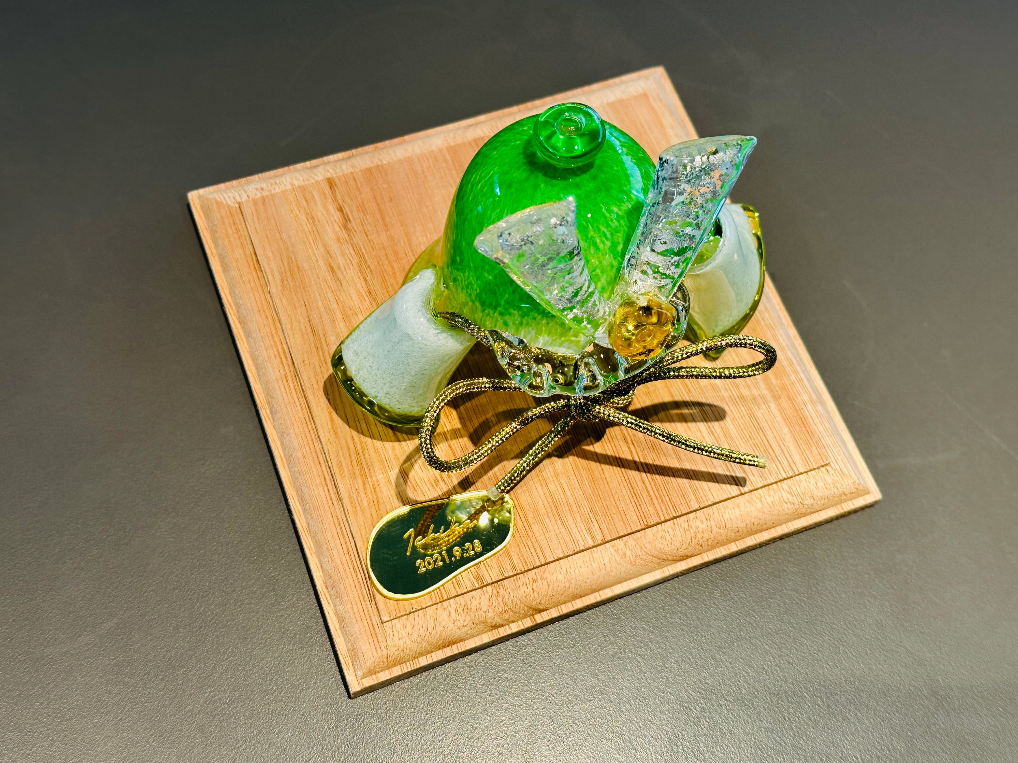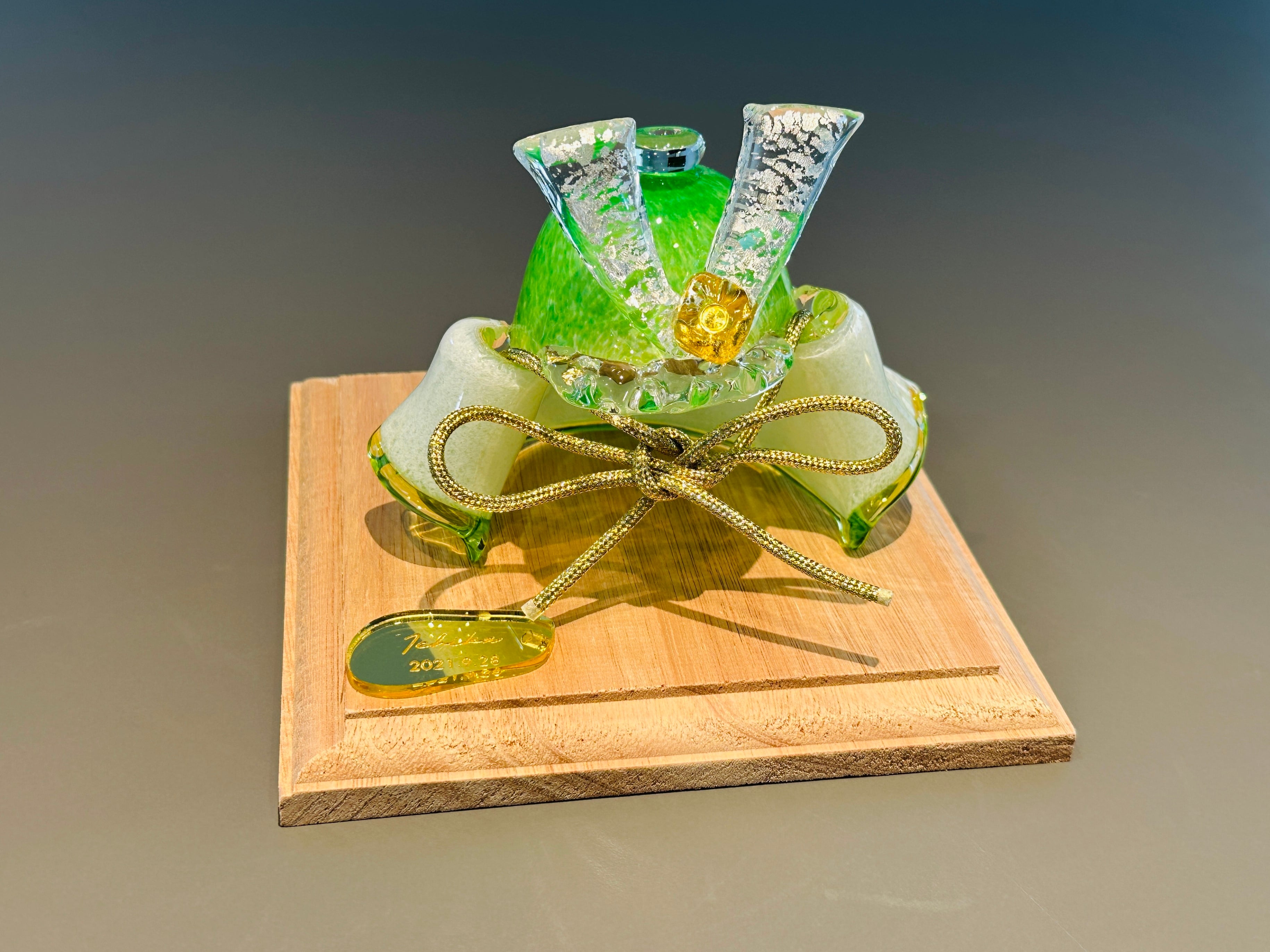 若葉の兜は、春の訪れを感じさせる爽やかなデザインが魅力のアイテムです。新緑の若葉をイメージした鮮やかなグリーンが、見る人の心を穏やかにし、心を豊かにする空間を演出します。葉のように流れるデザインは、息吹を感じる春を感じさせ、どんなインテリアにもぴったりです。 サイズ: 本体 縦9.5×横13×奥行8cm 木製台 15×15cm 高さ1.5cm デザイン ichi glass 原加奈子 制作 厚木グラススタジオ *手作りのため、形や色に多少の個体差がございます。