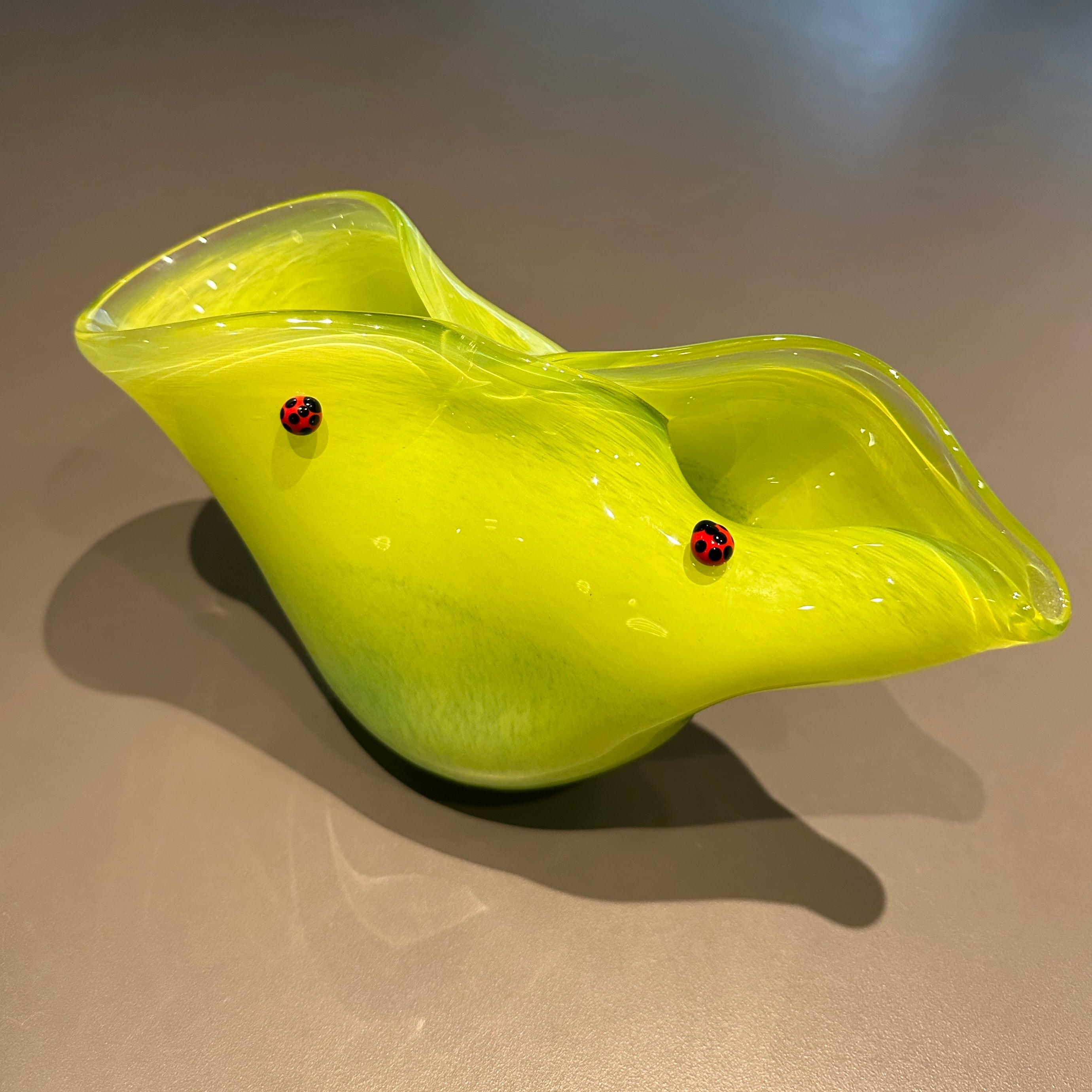 2匹のてんとう虫が、葉の上を仲良くお散歩しているイメージで制作しました。 自然の美しさが溢れるデザインで、見るたびに心を和ませてくれるアイテムです。 この花器は、てんとう虫の愛らしさと光る葉の新鮮さを象徴しています。 【カラー】 ・グリーン、イエロー 【サイズ】 ・高さ:約12cm ・横幅:約22cm デザイン ichi glass 原加奈子 制作 ichi glass 原加奈子 *手作りのため、形や色に多少の個体差がございます。サイズ比較のためオブジェと撮影しています。