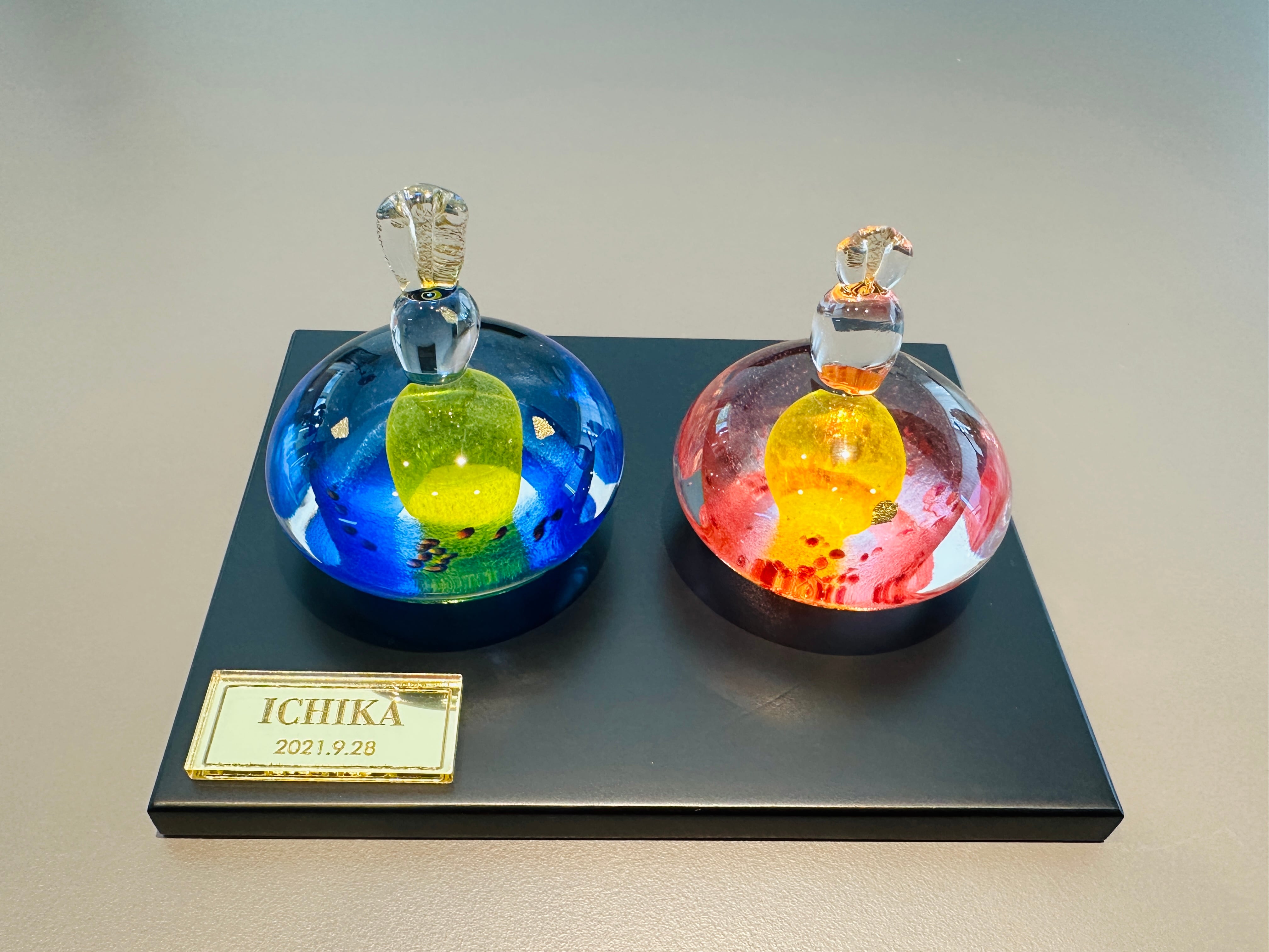 満月の夜に寄り添う男女をイメージしたガラス雛です。まるで和菓子のような愛らしい形。金箔の桜の花びらがガラスの中で舞っています。 ぽってりとした丸いフォルムも愛らしく、まるで和菓子のような雛人形です サイズ: 女雛 縦6.5×横5.5×奥行5.5cm 男雛 縦7×横5.5×奥行5.5cm 台 15×12cm 厚み1cm デザイン ichi glass 原加奈子 制作 ichi glass 原加奈子 *誕生石は非対応のお雛様です。 *金額は一体の価格となります。 *手作りのため、形や色に多少の個体差がございます。