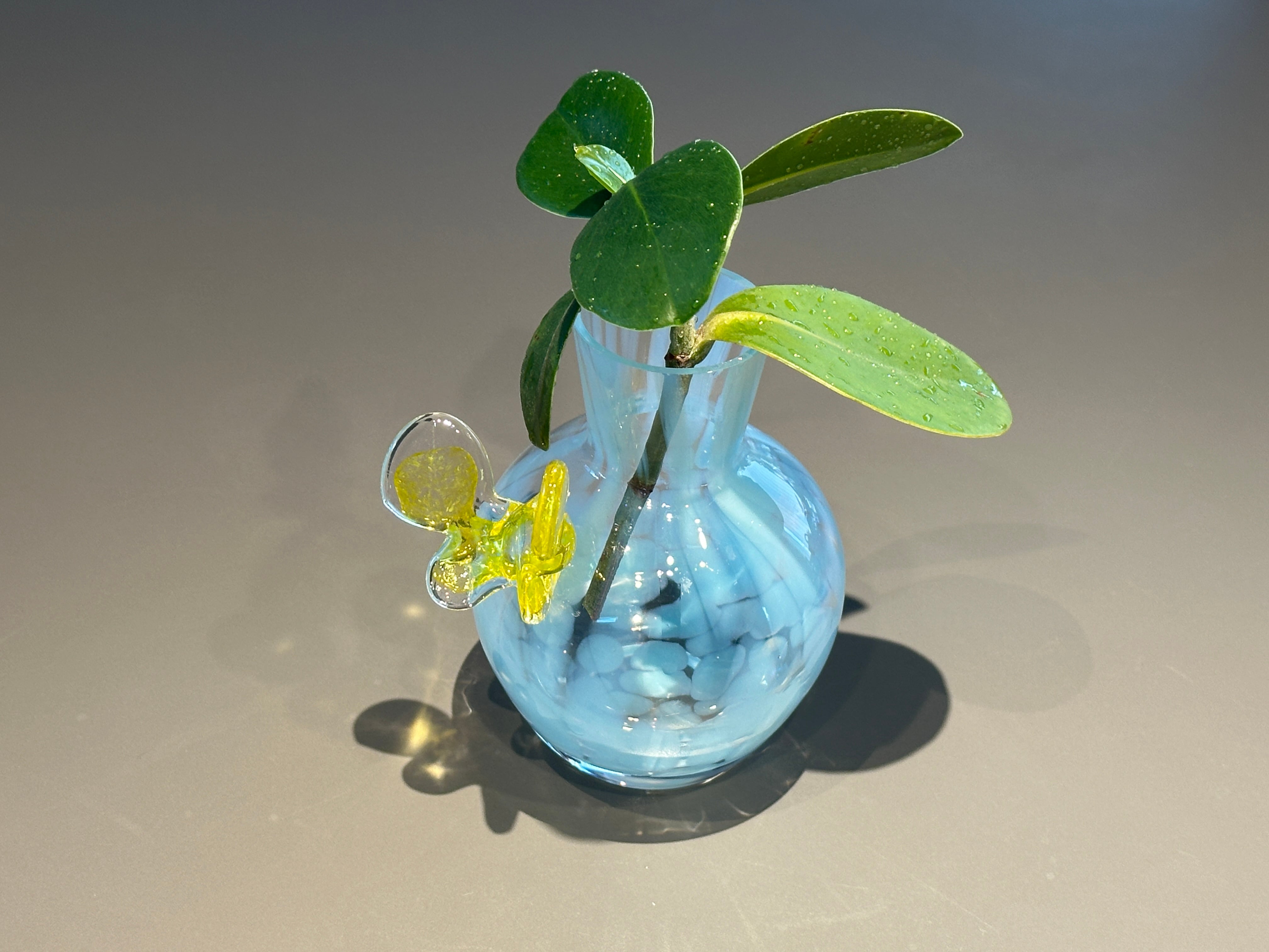 淡い色合いを持つ蝶の花器、 花一輪かざると、ふっと蝶がとまっているようなデザインです。 その優雅なフォルムと繊細なデザインが特徴で、飾るだけでお部屋に華やかさをプラスします。蝶のモチーフは、軽やかに舞う姿を模しており、見る人に心の安らぎを与えてくれます。特別な瞬間を演出するアイテムとして、また大切な方への贈り物としてもぴったりです。 サイズ:縦12×横7×奥行8cm デザイン ichi glass 原加奈子 制作 ichi glass 原加奈子